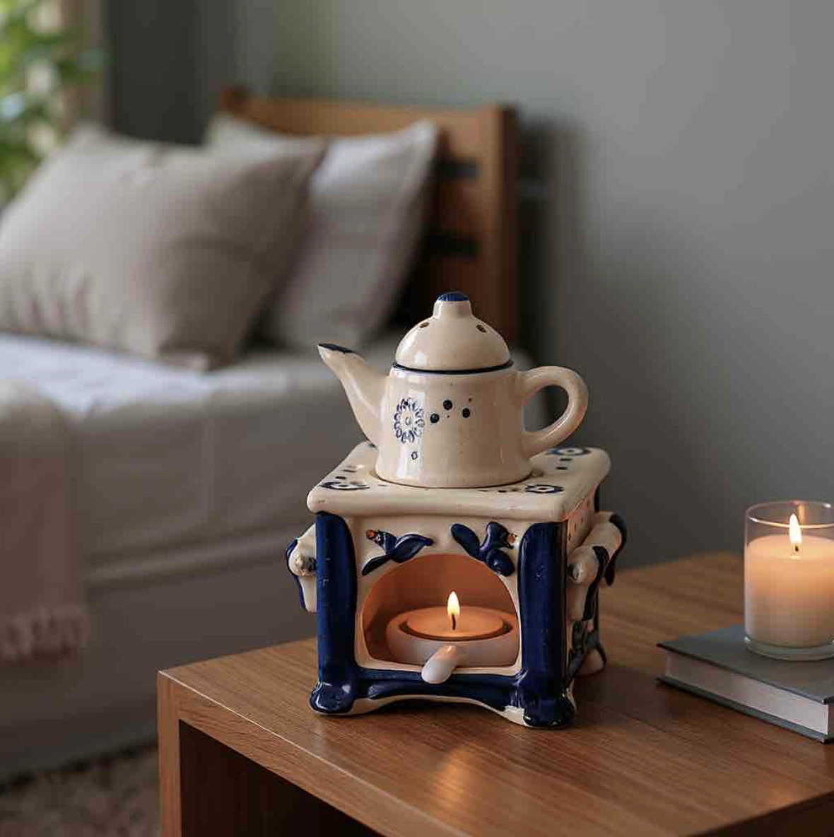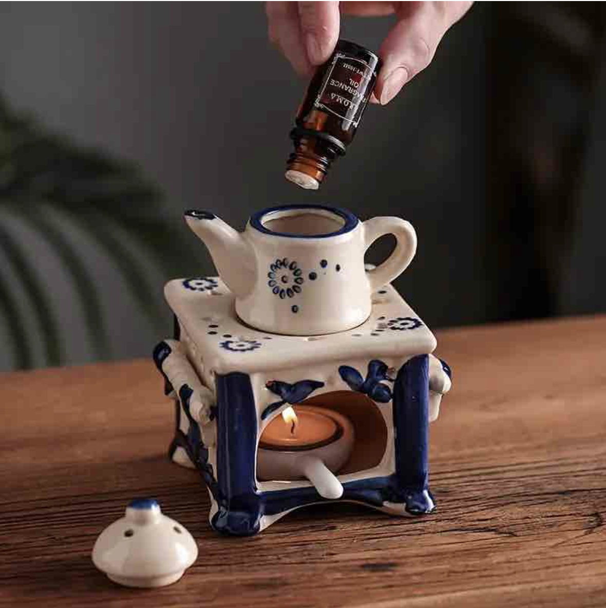 Hey, check this out! It’s a ceramic diffuser that looks just like a tiny teapot! How cute is that? The blue floral design against the white ceramic is like a breath of fresh countryside air. Its super easy to usejust pop a tealight underneath, and let the soothing scents flow. And heres the thingits not just functional, its a conversation starter. Imagine this on your coffee table, scenting the room while you enjoy your Sunday chai with the windows open. Bliss, right?